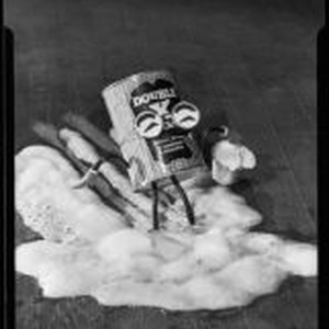 Access to this collection is generously supported by Arcadia funds. Photograph for advertisement for "Double X Floor Cleaner" with a container of the cleaner with added arms, legs and eyeglasses on a hardwood floor. The container figure carries a bucket of suds and cleans the floor with mop ends attached to its feet. Text from negative sleeve: Double X US & Miner. E W