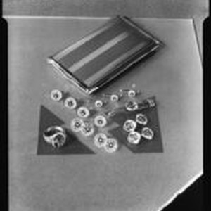 Access to this collection is generously supported by Arcadia funds. Brock & Company Jewelers was the most important jewelry and giftware store in Los Angeles. Founded by George A. Brock in 1903, it was sold in 1964 and the business ended s few years later. It was located at 515 West Seventh St. and had a 2nd location at the Beverly-Wilshire Hotel. Men's furnishings including a ring with precious stone, cuff links, a tie clip and a cigarette case at the Brock & Company jewelry and gift store. Text from negative sleeve: Brock's 10