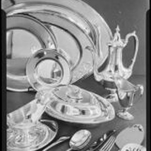 Access to this collection is generously supported by Arcadia funds. Brock & Company Jewelers was the most important jewelry and giftware store in Los Angeles. Founded by George A. Brock in 1903, it was sold in 1964 and the business ended s few years later. It was located at 515 West Seventh St. and had a 2nd location at the Beverly-Wilshire Hotel Sterling silver tableware set with 2 platters, a large and small plate, a coffee or tea pot, a creamer, a lidded serving bowl, a gravy or sauce boat, serving pieces and silverware, including 2 spoons and 2 cake servers. Text from negative sleeve: Brock's