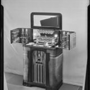 Access to this collection is generously supported by Arcadia funds. Photograph of a wooden cabinet combining a radio and a bar, with the bar portion open. "Radiobar Philco" is above the 3 knobs. The Radiobar company was formed by Earnest J. Krauss in 1931, 2 years before the end of Prohibition, in Los Angeles. By 1935 Radiobar was using Philco chassis. Brock & Company Jewelers was the most important jewelry and giftware store in Los Angeles. Founded by George A. Brock in 1903, it was sold in 1964 and the business ended s few years later. It was located at 515 West Seventh St. and had a 2nd location at the Beverly-Wilshire Hotel.