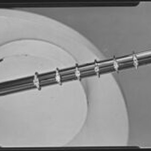 Access to this collection is generously supported by Arcadia funds. Brock & Company Jewelers was the most important jewelry and giftware store in Los Angeles. Founded by George A. Brock in 1903, it was sold in 1964 and the business ended s few years later. It was located at 515 West Seventh St. and had a 2nd location at the Beverly-Wilshire Hotel. Six diamond rings displayed on a metal dowel at Brock & Company jewelry and gift store. Text from negative sleeve: Brock