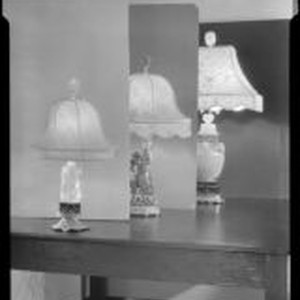 Access to this collection is generously supported by Arcadia funds. Brock & Company Jewelers was the most important jewelry and giftware store in Los Angeles. Founded by George A. Brock in 1903, it was sold in 1964 and the business ended s few years later. It was located at 515 West Seventh St. and had a 2nd location at the Beverly-Wilshire Hotel. Three table lamps made from Asian-inspired sculpture with ornate metal bases and bell-shaped shades. Text from negative sleeve: Brock