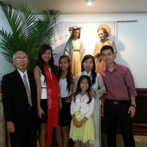 Scope/Content: John Pham (right) with his family (L-R) Lap Pham (father), Phung Do (niece), Phi Phi Do (niece), Phuong Phi Do (niece), Thuy Bich Pham (sister), Ontario CA, 2014