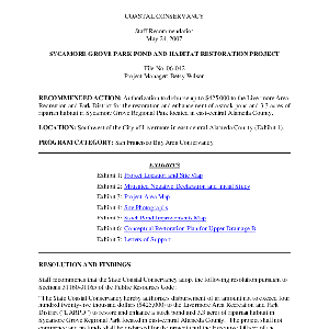 Scope/Content: File No. 06-042.; "Project Manager: Betsy Wilson."; Title from caption.; Subject: Recommended action: Authorization to disburse up to $425,000 to the Livermore Area Recreation and Park District for the restoration and enhancement of a stock pond and 3.3 acres of riparian habitat in Sycamore Grove Regional Park located in east-central Alameda County.
