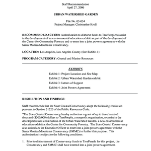 Scope/Content: File No. 05-034.; "Project Manager: Christopher Kroll."; Title from PDF caption.; Subject: Recommended action: Authorization to disburse funds to TreePeople to assist in the development of an environmental education exhibit as part of the development of the Center for Community Forestry and to enter into a joint powers agreement with the Santa Monica Mountains Conservancy.