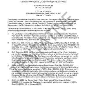 Administrative civil liability order R5-2010-XXXX, mandatory penalty in the matter of City of Rio Vista, Beach Wastewater Treatment Plant, Solano County