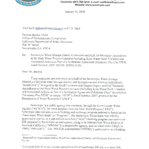 Semitropic Water Storage District comments on DEIR for Monterey amendment to the State Water Project contracts (including Kern Water Bank transfer) and associated actions as part of a settlement agreement (Monterey Plus), by DWR, dated October, 2007
