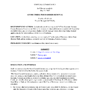 Scope/Content: Project No. 07-024-01.; "Project Manager: Jeff Melby."; Title from caption.; Subject: Recommended action: Authorization to disburse up to $62,973 to Southern Sonoma County Resource Conservation District to remove a bridge and instream concrete slab foundation on Adobe Creek and to replace these barriers to fish passage with a clear span bridge located approximately 0.5 mile northeast of the City of Petaluma.
