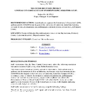 Scope/Content: Project No. 08-079-01.; "Project Manager: Trish Chapman."; Scope and content: Staff recommendation: Authorization to augment the Conservancy's December 3, 2009, authorization by $164,000 to the Regents of the University of California, Santa Cruz Campus, for study of coastal contaminants and anthropogenic stressors on southern sea otters, in Monterey County.