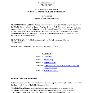 Scope/Content: File No. 03-028.; "Project Manager: Tom Gandesbery."; Title from caption.; Subject: Recommended action: Authorization to disburse up to $1,472,000 of grant funds from the Wildlife Conservation Board to the East Bay Regional Park District to restore seasonal wetlands within an area commonly known as the "Berkeley Meadow" and disburse up to $120,000 to the California Department of Parks and Recreation for the planning and design of an area commonly known as the "Brickyard", located at Eastshore State Park, City of Berkeley, along the shoreline of San Francisco Bay.