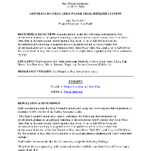 Scope/Content: Project No. 07-017.; "Project Manager: Ann Buell."; Title from caption.; Subject: Recommended action: Authorization to make the following disbursements for environmental analysis and project planning to implement the San Francisco Bay Area Water Trail Plan in the nine-county San Francisco Bay Area: 1) up to $20,000 to Grassetti Environmental Consulting to augment an existing professional services contract for environmental review of the San Francisco Bay Area Water Trail Plan, and 2) up to $20,000 to the Association of Bay Area Governments to conduct preliminary planning for future water trail signage.