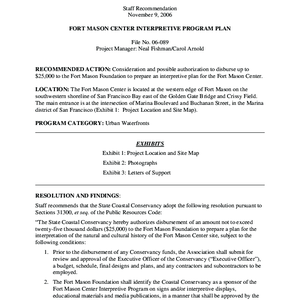 Scope/Content: Project No. 06-089.; "Project Managers: Neal Fishman and Carol Arnold G. Doherty."; Title from caption.; Subject: Recommended action: Consideration and possible authorization to disburse up to $25,000 to the Fort Mason Foundation to prepare an interpretive plan for the Fort Mason Center.