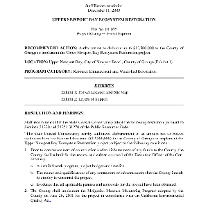 Scope/Content: Project No. 01-075.; "Project Manager: Trish Chapman."; Title from PDF caption.; Scope and content: Staff recommendation: Authorization to disburse up to $12,500,000 to the County of Orange to implement the Upper Newport Bay Ecosystem Restoration project.