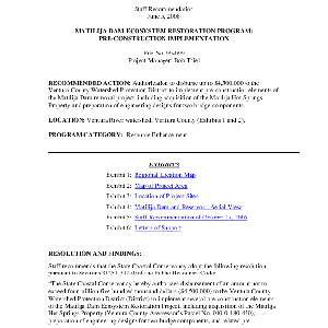 Scope/Content: Project No. 99-099.; "Project Manager: Bob Thiel."; Title from PDF caption.; Scope and content: Staff recommendation: Authorization to disburse up to $4,500,000 to the Ventura County Watershed Protection District to implement pre-construction elements of the Matilija Dam removal project, including acquisition of the Matilija Hot Springs Property and preparation of engineering designs for two bridge components.