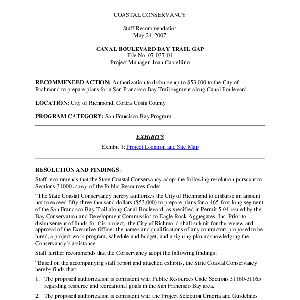 Scope/Content: Project No. 07-037-01.; "Project Manager: Joan Cardellino."; Title from caption.; Subject: Recommended action: Authorization to disburse up to $53,000 to the City of Richmond to prepare plans for a San Francisco Bay Trail segment along Canal Boulevard.