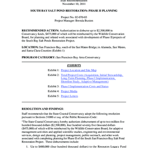 Scope/Content: Project No. 02-070-03.; "Project Manager: Brenda Buxton."; Scope and content: Staff recommendation: Authorization to disburse up to $2,500,000 in Conservancy funds, $475,000 of which will be reimbursed by the Wildlife Conservation Board, for planning and related work associated with development of Phase II projects of the South Bay Salt Ponds Restoration Project.