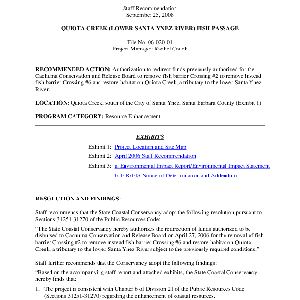 Scope/Content: Project No. 06-020-01.; "Project Manager: Rachel Couch."; Title from caption.; Subject: Recommended action: Authorization to redirect funds previously authorized for the Cachuma Conservation and Release Board to remove fish barrier Crossing #2 to remove instead fish barrier Crossing #6 and restore habitat on Quiota Creek, a tributary to the lower Santa Ynez River.