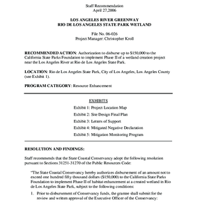 Scope/Content: File No. 06-026.; "Project Manager: Christopher Kroll."; Title from PDF caption.; Subject: Recommended action: Authorization to disburse up to $150,000 to the California State Parks Foundation to implement Phase II of a wetland creation project near the Los Angeles River at Rio de Los Angeles State Park.