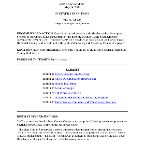 Scope/Content: Project No. 07-033.; "Project Manager: Su Corbaley."; Title from caption.; Subject: Recommended action: Consideration and possible authorization to distribute up to $75,000 to the United States Department of the Interior, Bureau of Land Management to construct the Fleener Creek Trail from Centerville Road to the Pacific Ocean at Fleener Creek, Humboldt County, and adoption of a Mitigation Monitoring and Reporting Plan for the project.