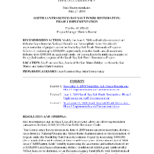 Scope/Content: Project No. 02-070-02.; "Project Manager: Brenda Buxton."; Scope and content: Staff recommendation: Modify the June 4, 2009 authorization to accept and disburse funds from the National Oceanic and Atmospheric Administration for implementation of projects under the South Bay Salt Ponds Restoration Project as follows: 1) redirect up to $300,000 in previously awarded funds, and 2) accept and disburse up to $300,000 in additional funds, for fish studies to be undertaken as part of the applied studies program of the South Bay Salt Ponds Restoration Project.
