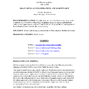 Scope/Content: Project No. 08-048-01.; "Project Manager: Deborah Hirst."; Title from caption.; Subject: Recommended action: Consideration and possible Conservancy authorization to disburse up to $10,000 to Moat Creek Managing Agency to operate and maintain public access improvements at Moat Creek Beach and along the Moat Creek segment of the California Coastal Trail in Mendocino County.