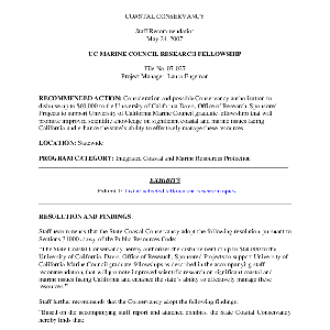 Scope/Content: Project No. 07-027.; "Project Manager: Laura Engeman."; Title from caption.; Subject: Recommended action: Consideration and possible Conservancy authorization to disburse up to $60,000 to the University of California Davis, Office of Research, Sponsored Projects to support University of California Marine Council graduate fellowships that will promote improved scientific knowledge on significant coastal and marine issues facing California and enhance the state's ability to effectively manage these resources.