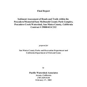 Sediment assessment of roads and trails within the Pescadero/Memorial/Sam McDonald County Park Complex, Pescadero Creek Watershed, San Mateo County, California: final report