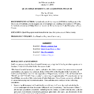 Scope/Content: Project No. 07-040.; "Project Manager: Betsy Wilson."; Title from PDF caption.; Scope and content: Staff recommendation: Authorization to disburse up to $485,000 to the Regents of the University of California for the acquisition of two properties, totaling approximately 157 acres, for inclusion in the Quail Ridge Reserve, located on the south shore of Lake Berryessa in Napa County.
