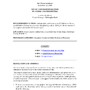 Scope/Content: Project No. 08-090-01.; "Project Manager: Christopher Kroll."; Title from caption.; Subject: Recommended action: Authorization to disburse up to $22,000 to the Endangered Habitats Conservancy to undertake planning and permitting for the restoration of native plant communities in Swan Canyon.