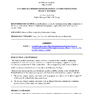 Scope/Content: Project No. 98-055-06.; "Project Manager: Moira McEnespy."; Title from caption.; Subject: Recommended action: Authorization to revise the watershed monitoring component of the Navarro Watershed Phase V Implementation project, approved by the Conservancy in October 2006.