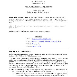 Scope/Content: Project No. 08-073-01.; "Project Manager: Michelle Jesperson."; Title from caption.; Subject: Recommended action: Authorization to disburse up to $1,400,000 to the East Bay Regional Park District for the acquisition of the approximately 333-acre Chaparral Spring property for open space, wildlife and habitat preservation, public access, and limited agricultural uses.