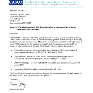 CASQA information for Blue Ribbon Panel on development of quantitative measurements for stormwater