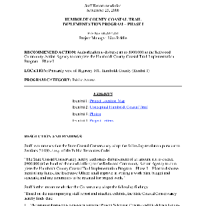 Scope/Content: Project No. 08-092-01.; "Project Manager: Liza Riddle."; Title from caption.; Subject: Recommended action: Authorization to disburse up to $900,000 to the Redwood Community Action Agency to complete the Humboldt County Coastal Trail Implementation Program, Phase I.