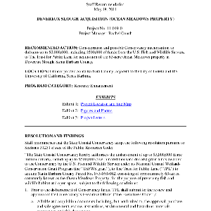 Scope/Content: Project No. 11-019-01.; "Project Manager: Rachel Couch."; Scope and content: Staff recommendation: Consideration and possible Conservancy authorization to disburse up to $3,000,000, including $500,000 of funds from the U.S. Fish and Wildlife Service, to The Trust for Public Land for acquisition of the 63-acre Ocean Meadows property in Devereux Slough, Santa Barbara County.