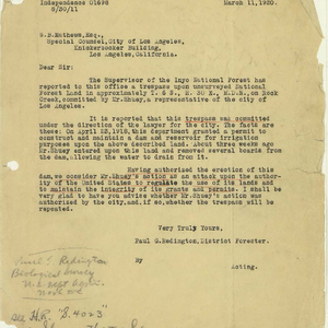 Scope/Content: Correspondence from Paul G. Redington, District Forester to W. B. Mathews, Esq., Special Counsel, City of Los Angeles.