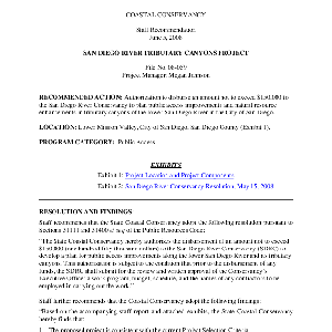 Scope/Content: Project No. 08-059.; "Project Manager: Megan Johnson."; Title from PDF caption.; Scope and content: Staff recommendation: Authorization to disburse an amount not to exceed $150,000 to the San Diego River Conservancy to plan public access improvements and natural resource enhancements in tributary canyons of the lower San Diego River in the City of San Diego.