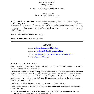 Scope/Content: Project No. 05-014-02.; "Project Manager: Deborah Hirst."; Title from caption.; Subject: Recommended action: Authorization to revise the Gualala Access Trails project authorized by the Conservancy on May 18, 2005 by removing the planned construction of cable steps and trail improvements to the beach at St. Orres in Gualala, Mendocino County, and adding the construction of up to two viewing platforms with interpretive panels above the highly erosive bluff at St. Orres.