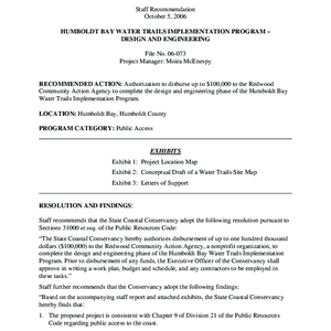 Scope/Content: File No. 06-073.; "Project Manager: Moira McEnespy."; Title from PDF caption.; Subject: Recommended action: Authorization to disburse up to $100,000 to the Redwood Community Action Agency to complete the design and engineering phase of the Humboldt Bay Water Trails Implementation Program.