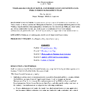 Scope/Content: Project No. 08-014.; "Project Manager: Michelle Jesperson."; Title from PDF caption.; Scope and content: Staff recommendation: Authorization to disburse up to $250,000 to the Land Trust of Napa County to prepare an Interim Management Plan for the stewardship and management of the Wildlake Ranch and Duff Ranch properties, Robert Louis Stevenson State Park, and other public and private lands in the vicinity and modification of conditions of prior Conversancy authorization of grant to the Land Trust of Napa County for acquisition of the Wildlake Ranch.