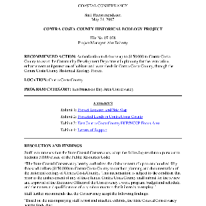 Scope/Content: Project No. 07-028.; "Project Manager: Abe Doherty."; Title from caption.; Subject: Recommended action: Authorization to disburse up to $150,000 to Contra Costa County to assist the Community Development Department in planning for the restoration, enhancement and protection of habitats and watersheds in Contra Costa County, through the Contra Costa County Historical Ecology Project.