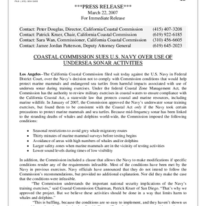 Text / Coastal Commission sues U.S. Navy over use of undersea sonar activities