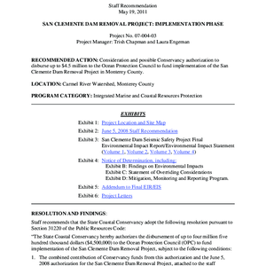 Scope/Content: Project No. 07-004-03.; "Project Managers: Trish Chapman and Laura Engeman."; Subject: Recommended action: Consideration and possible Conservancy authorization to disburse up to $4.5 million to the Ocean Protection Council to fund implementation of the San Clemente Dam Removal Project in Monterey County.