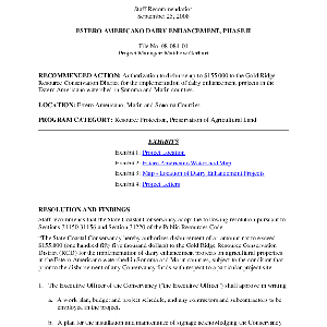 Scope/Content: Project No. 08-084-01.; "Project Manager: Matthew Gerhart."; Title from caption.; Subject: Authorization to disburse up to $155,000 to the Gold Ridge Resource Conservation District for the implementation of dairy enhancement projects in the Estero Americano watershed in Sonoma and Marin counties.