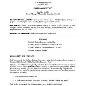 Scope/Content: File No. 06-028.; "Project Managers: Maxene Spellman and Carol Arnold."; Title from PDF caption.; Subject: Recommended action: Authorization to disburse up to $100,000 to Urban Ecology to prepare a conceptual plan for the East Bay Greenway in Alameda County.
