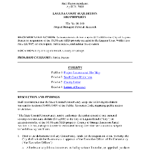 Scope/Content: Project No. 08-019.; "Project Manager: Deborah Ruddock."; Title from PDF caption.; Scope and content: Staff recommendation: Authorization to disburse up to $175,000 to the City of Laguna Beach for acquisition of the 10.38-acre SBD property adjacent to the Laguna Coast Wilderness Park (LCWP) for open space, public access, and habitat preservation.