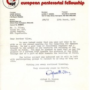 A letter from Alfred F. Missen to Ludvik Üllen informing mr. Üllen that the council will help out Pentecostals in Sisak and students at the Bible school. [Description English/roman)] Pismo Alfreda F. Missena Ludviku Üllenu u kojemu ga obavještava da će vijeće europskih pentekostalaca pomoći pentekostalce u Sisku i studente biblijske škole. [Description (original non-English/roman language/script)]