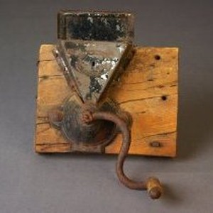 Hand crank grinder made of a tin hopper mounted on a cast iron base and both mounted on a wood back. Hopper was originally painted black.
