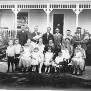 Photo, black and white: Barlow family photo: Back row L-R: Oscar A. Hallberg, Ray Newman holding baby Sam, Wilbur (Bill) Barlow, Leland Barlow, Mr. Gail Fehrensen, Denman Barlow holding Tommy Barlow. Front row L-R: Robert Hallberg, Donald Hallberg,