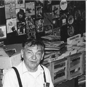 Merchant at cash register with music memorabilia and vinyl records for sale behind him.