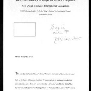 The fertile landscape of Tampa site for new evangelistic roll out at Women's International Convention, 2003. Incomplete paper on Willie Mae Rivers. [Description English/roman)]